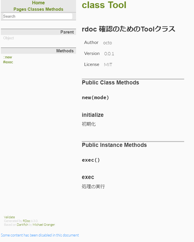 上記のような、クラスを書いて rdoc tool.rb を実行。./doc以下にページが生成される。
