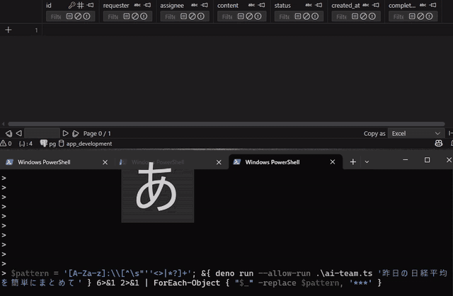 1 2 3 4 > deno run --allow-run .\ai-team.ts "昨日の日経平均を簡単にまとめて" > $pattern = '[A-Za-z]:\\[^\s"' '<>|*?]+' ; &{ deno run --allow-run .\ai-team.ts "昨日の日経平均を簡単にまとめて" } 6>&1 2>&1 | ForEach-Object { "$_ " -replace $pattern , '***' }